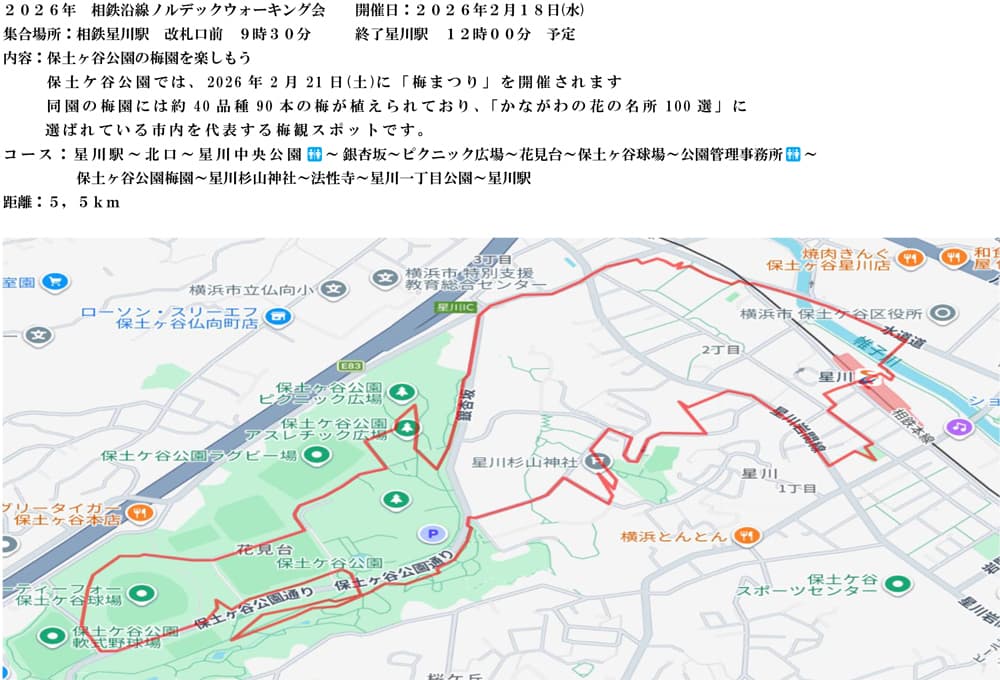 コース:星川駅~北口~星川中央公園🚻~銀杏坂~ピクニック広場~花見台~保土ヶ谷球場~公園管理事務所🚻~保土ヶ谷公園梅園~星川杉山神社~法性寺~星川一丁目公園~星川駅